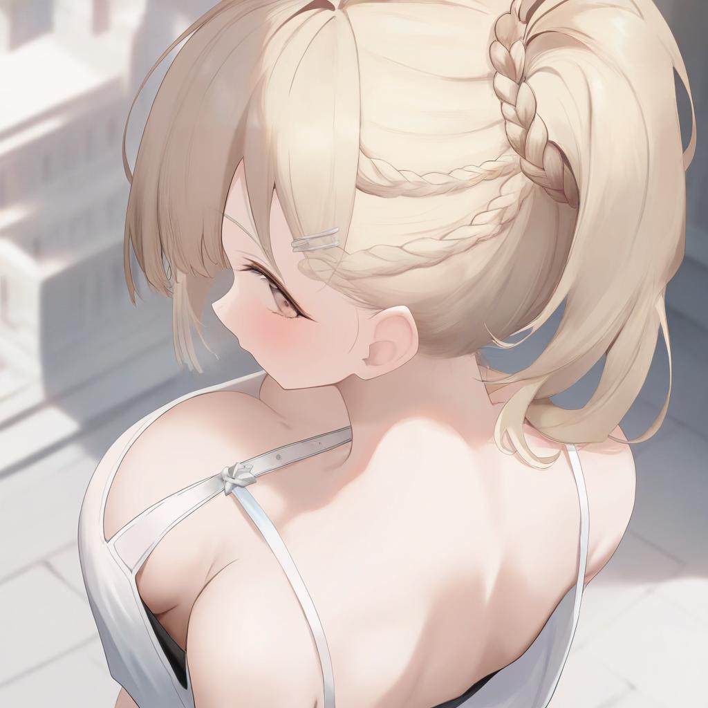 1girl, braided crown, brown eyes, ash blonde, hair ornament, ponytail, hairclip, temple, large breasts, downblouse from behind, downblouse, from behind, tank top , white tank top, cleavage, from above, nape, head down, looking at viewer, looking back, looking up, sideways glance