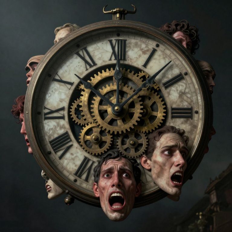 In the surrealist tradition, an immense clock composed of distorted faces drifts in a vast, shadowy expanse, its intricate gears meshing between contorted teeth. This overhead view reveals each individual's terror as the clock rotates, casting unsettling shadows across their features and creating an eerie ambiance. The hyper-realistic, richly detailed scene aims to instill both dread and awe, pondering the nature of time and humanity's place within it.