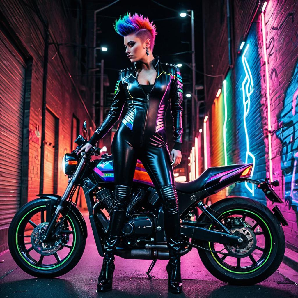 Athletic woman with iridescent rainbow faux hawk hairstyle wearing a glowing reflective leather and latex biker catsuit and armored knee-high boots. She poses confidently beside a modern motorcycle in a dark urban alley illuminated by vibrant neon graffiti and colorful LED lights at night.