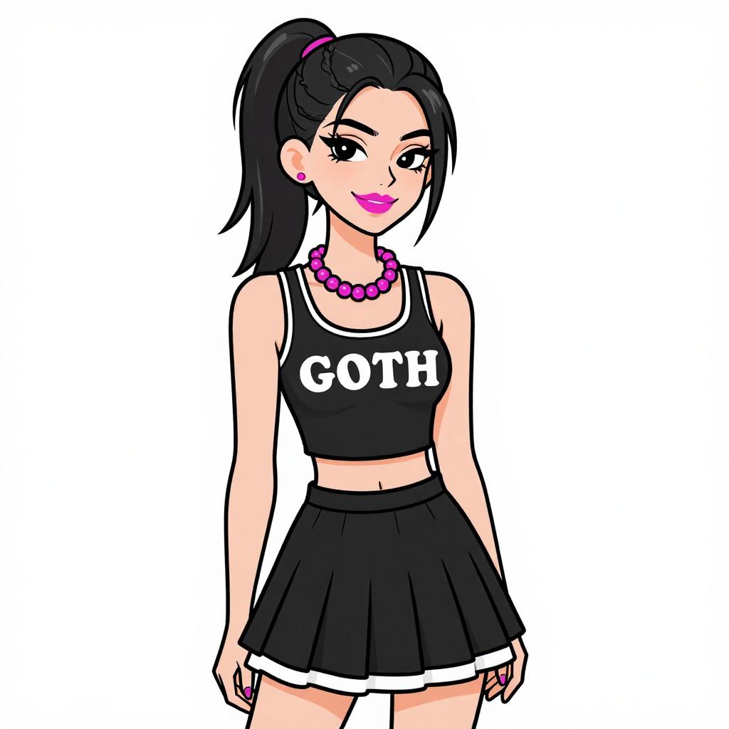 Woman with pretty face and pretty hair. smiling Woman, modern goth, black pleated mini skirt with white hem, matching cropped tank top with white collar and 'GOTH' text, pink chunky necklace, pink lips, dark eyeliner, stud earrings, hair in a ponytail with twisted side locks, white studio background. --sref 1467