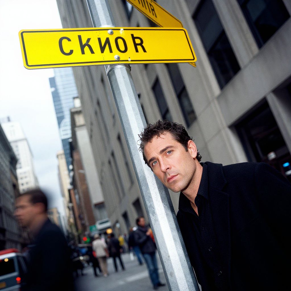 Urban landscape, tilted frame, man standing beside bright yellow street sign, bold typography, concrete buildings, city life, blurred motion, vibrant colors, shallow depth of field, dramatic perspective, 8K resolution, cinematic feel. Man has masculine face and piercing eyes