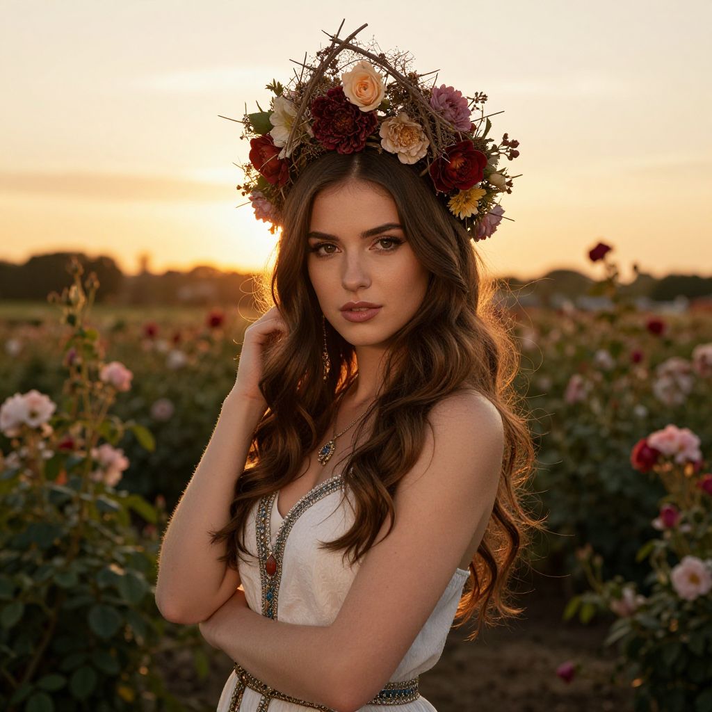 Photograph of a young white woman with long, wavy brown hair and fair skin standing in a sunset-lit rose garden. She wears a white, sleeveless dress with silver embellishments and a floral crown featuring dark red, orange, and white roses. Her right hand touches her hair while her left arm is crossed over her chest. The background is blurred, showcasing rows of blooming roses with the sun setting behind her, casting a warm, golden glow. Her makeup is natural, enhancing her striking features. The overall mood is ethereal and romantic.
