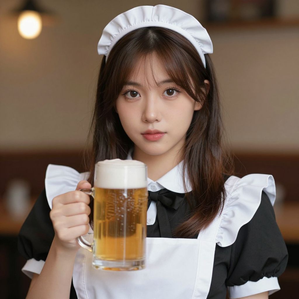 Photograph of an East Asian woman with fair skin and straight, dark brown hair, wearing a traditional black and white French maid outfit with a frilled white headpiece. She holds a glass mug of frothy beer in her right hand, positioned in front of her chest. Her large, dark eyes gaze directly at the camera with a neutral expression. The background is blurred, featuring warm, dim lighting and brown wooden shelves, suggesting a cozy, indoor setting, possibly a bar or café. The focus is sharply on her and the beer mug.