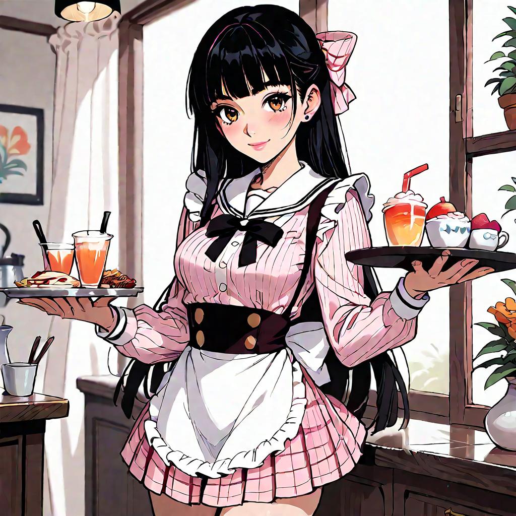 Anime Waitress in Pink Uniform Holding Trays