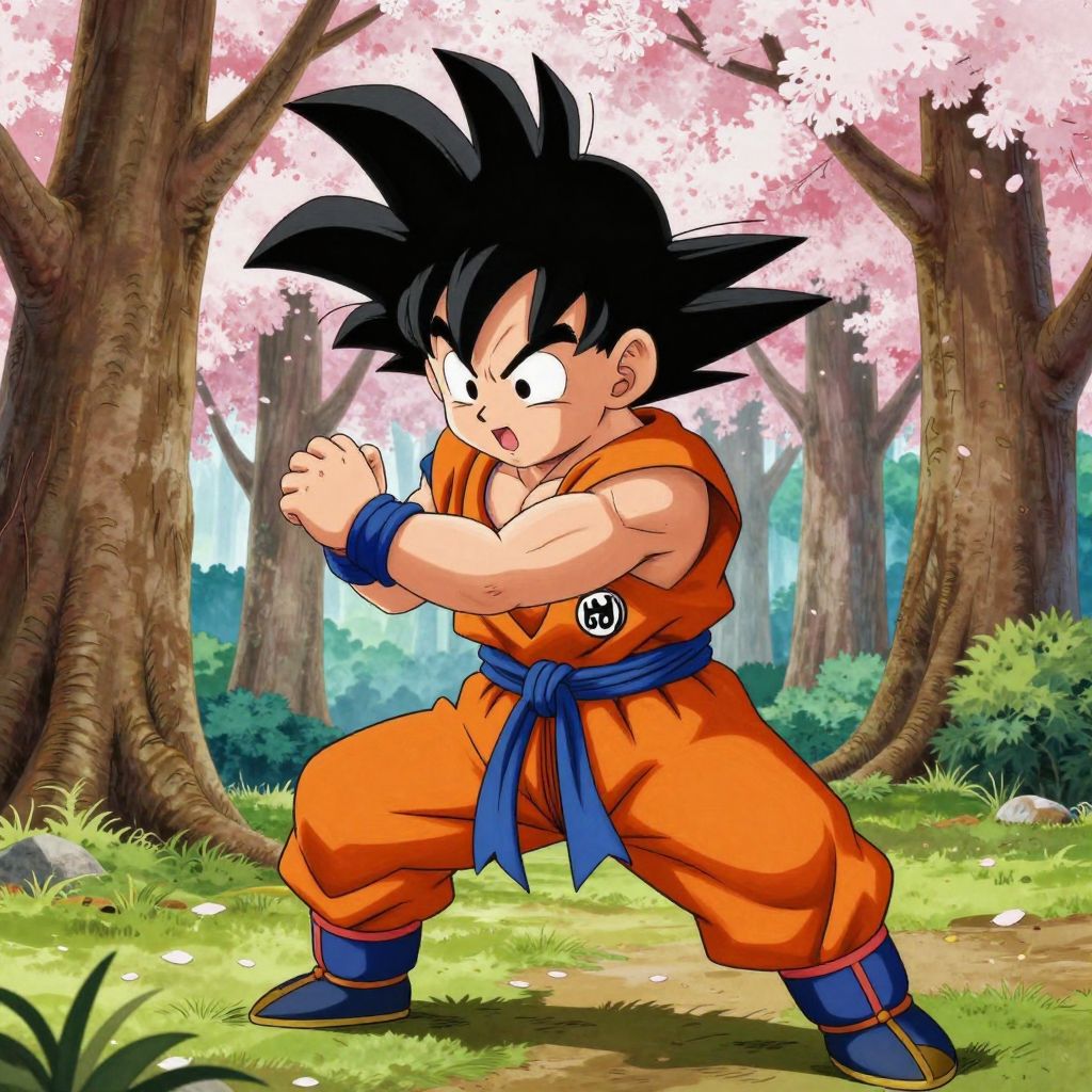 A portrait of kid goku, training in a forest, japan, cherry tree, by akira toriyama, hiper realistic, comic, anime, ultra detailed, intricate details, artstation, 4 k.