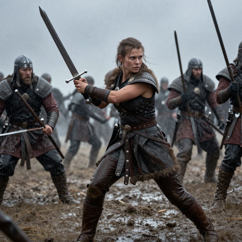 A fierce, mud-covered Viking warrior woman with short brown hair and a giant sword, fighting in a muddy battlefield under heavy rain, surrounded by soldiers in an epic battle.