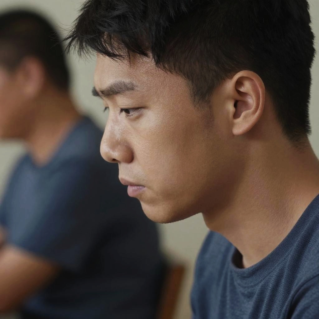 Close-up photograph of a serious young Asian man with short black hair, wearing a dark blue shirt, profile view, blurred background.