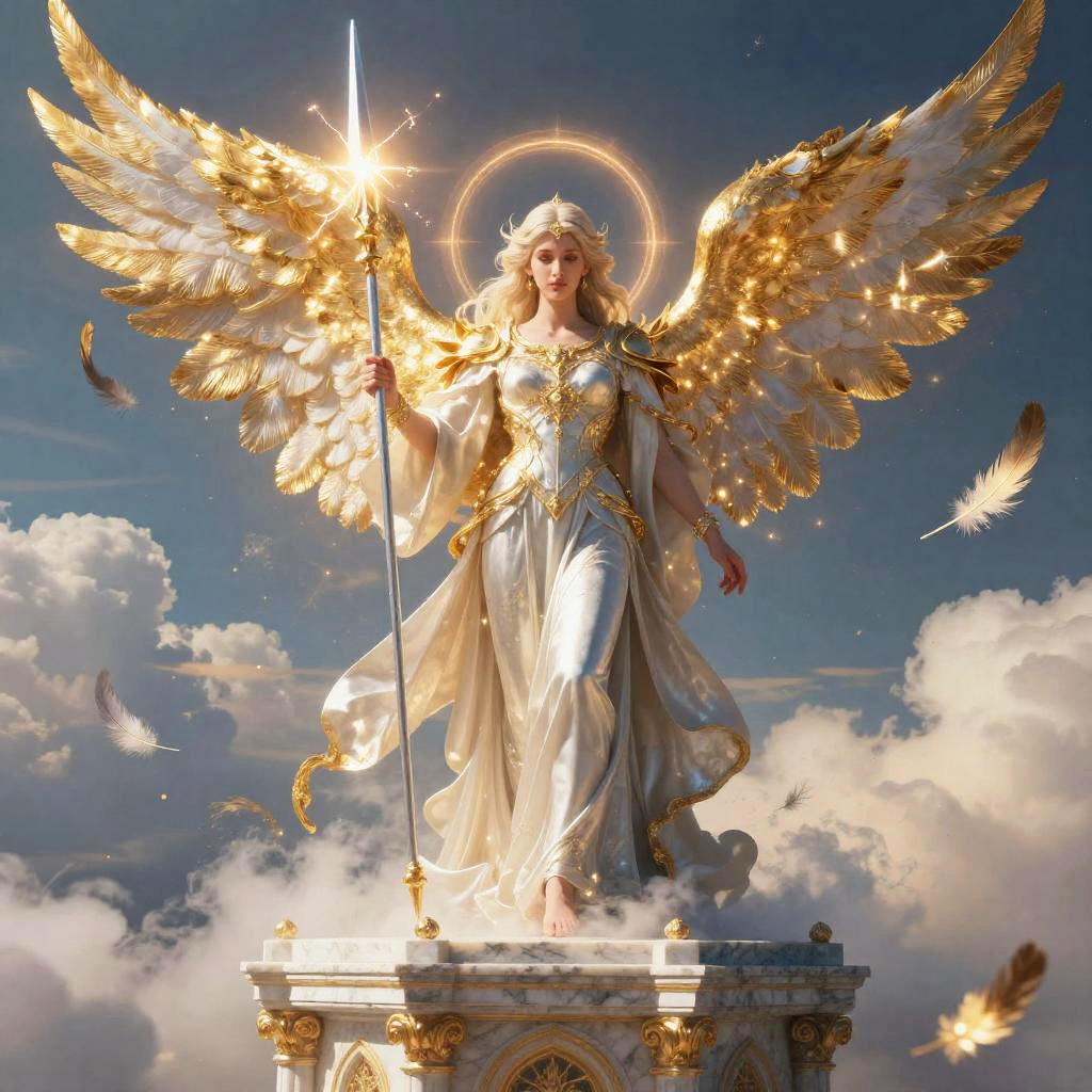 An epic fantasy scene of a celestial guardian angel, wielding a radiant spear crackling with holy light, standing in a floating marble temple in the clouds, surrounded by glowing golden wings and shimmering feathers, with soft heavenly light with iridescent halos, highly detailed, cinematic composition