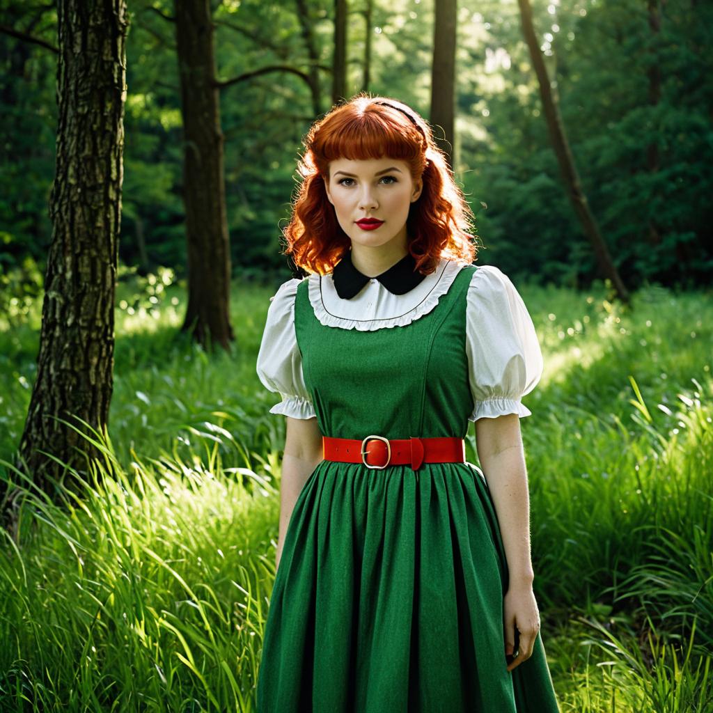 Adult dorothy woman costume, photorealistic portrait of a red-haired woman, standing in a forest, wearing a green pinafore dress with white puffed sleeves, red belt, and black collar, sunlight filtering through trees, lush green grass in background, realistic ure, natural light, detailed clothing, serene expression, realistic style, outdoor setting, summer atmosphere