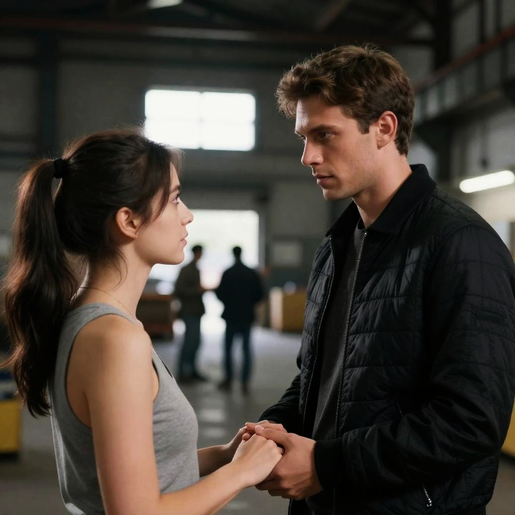 Photograph of two people leaning out of a blue and white truck door. Woman with long, light brown hair, wearing a plaid shirt, looks to the left. Man with short, dark hair, wearing a black leather jacket and green shirt, looks forward with a determined expression. Background includes the truck's interior. Both have fair skin. The man's arm is around the woman's shoulders.
