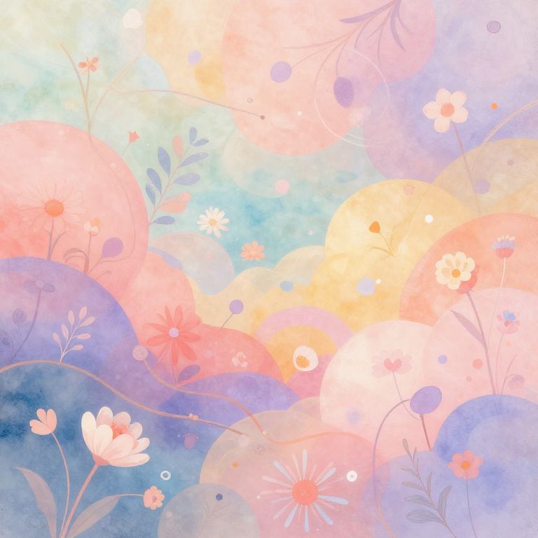 Whimsical watercolor painting of pastel-colored flowers and soft, overlapping circles in pink, blue, and orange, creating a dreamy, eth