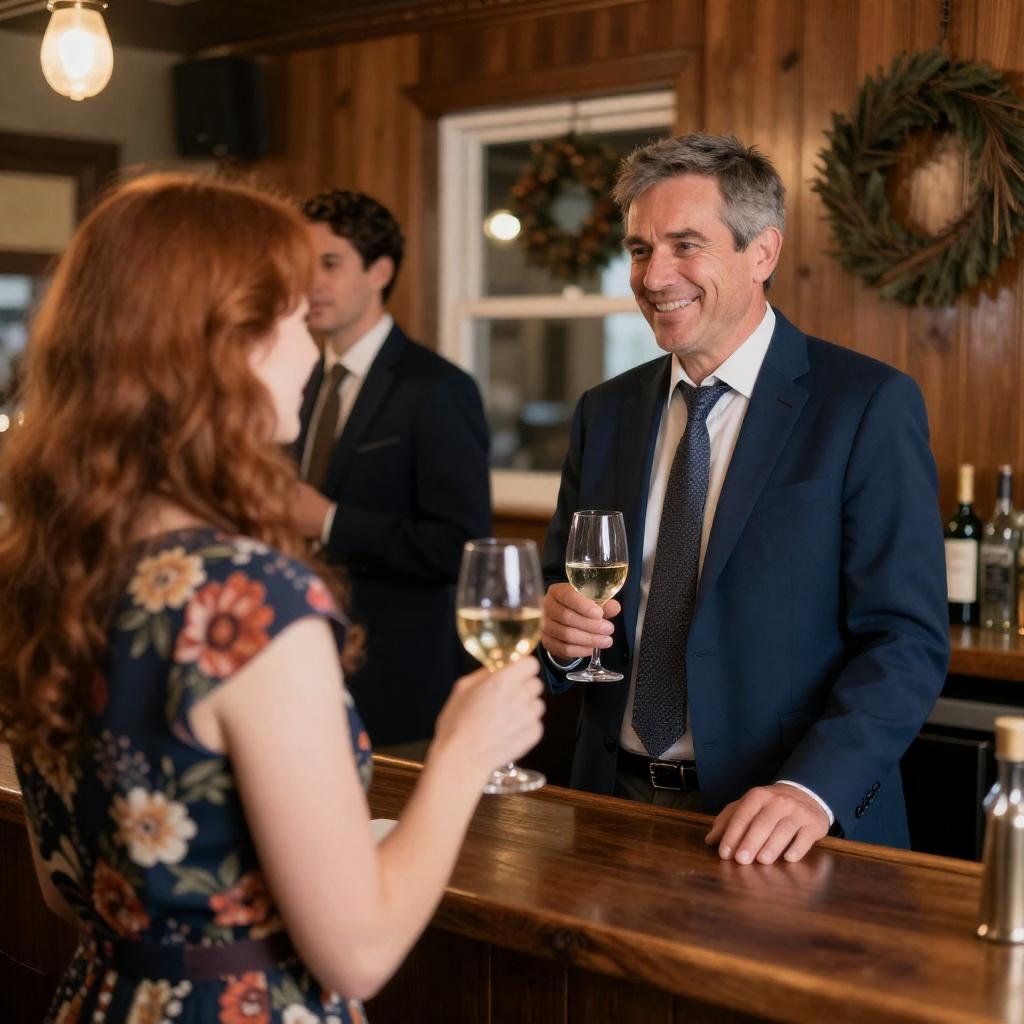 Photograph of a rustic indoor event. Middle-aged man in blue suit and tie, holding a glass, smiling at a woman with curly red hair in a floral dress, leaning on a wooden bar. Background: wooden walls, barrel, people chatting.