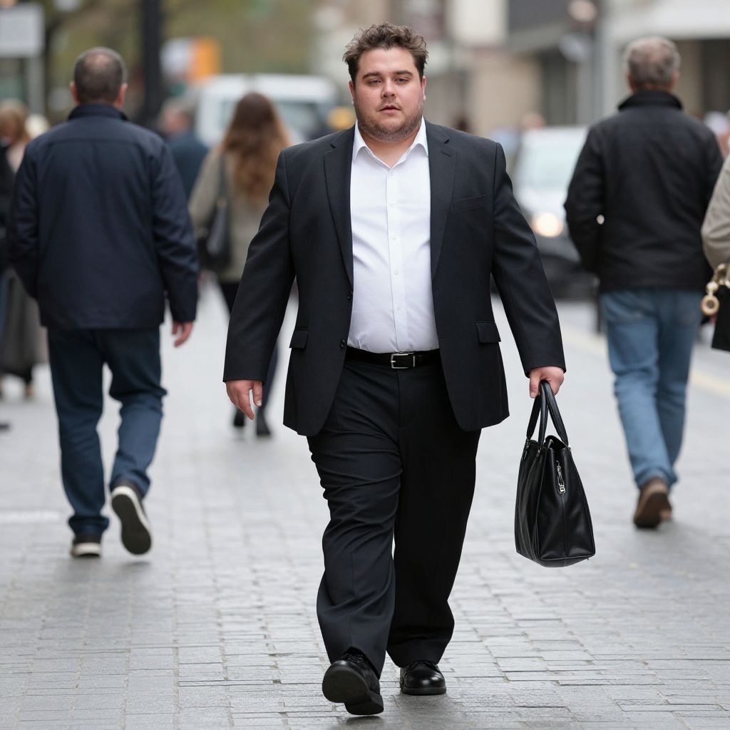 Photograph of a Caucasian man with short, curly brown hair and a beard, wearing a black suit, white dress shirt, and black trousers. He holds a black leather bag in his right hand and walks confidently on a busy, urban sidewalk. The background shows blurred pedestrians, including a man in a black jacket and blue jeans, and a woman with long brown hair. The pavement is gray and slightly wet, suggesting recent rain. The scene is set in a city environment with indistinct buildings and street signs in the distance. The man's expression is serious, and the overall composition is sharp with a shallow depth of field.