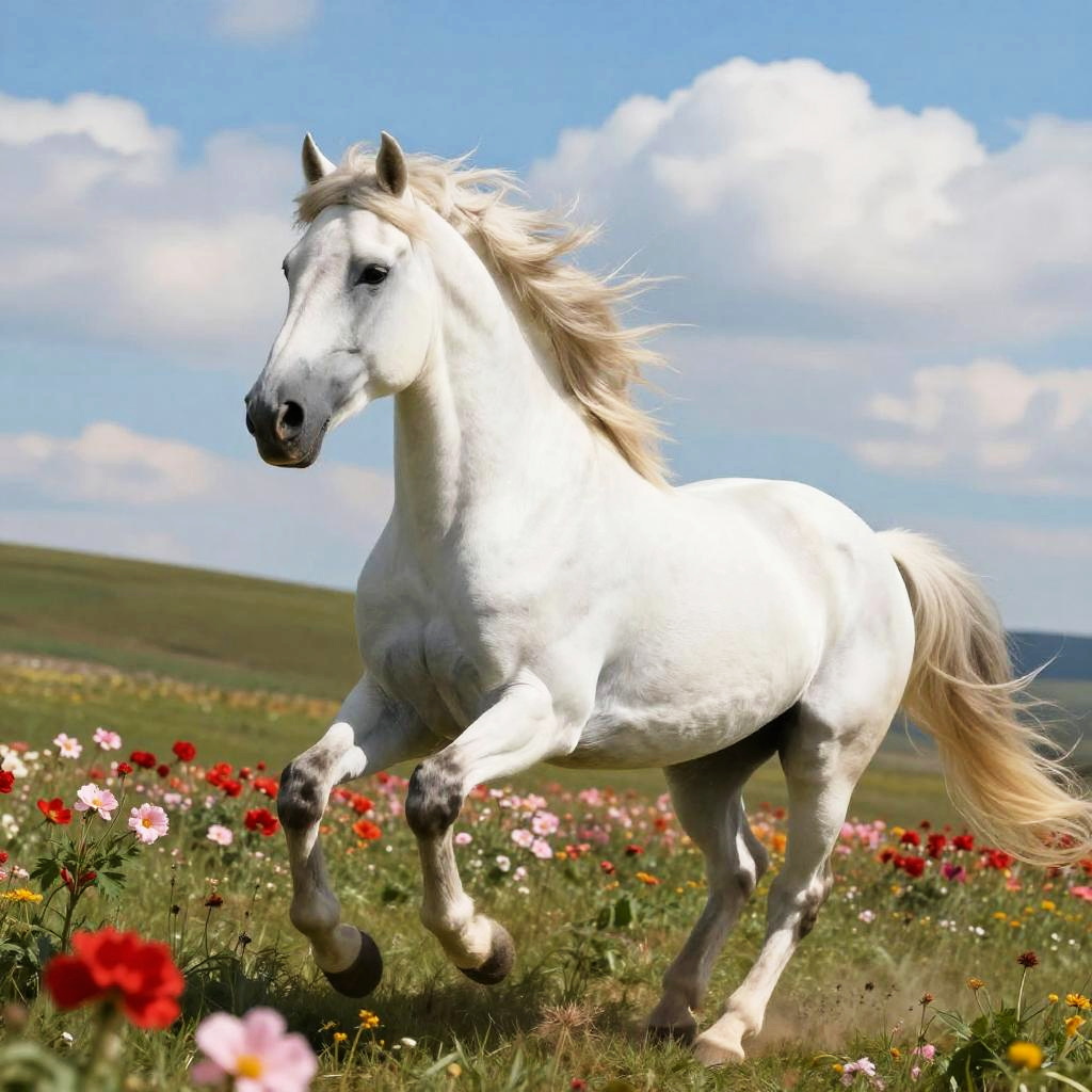 Photograph of a majestic white horse galloping on a lush, flower-covered hill. The horse's mane and tail are flowing, and it looks powerful and graceful. The background features a bright blue sky with fluffy white clouds. The vibrant red and pink flowers contrast beautifully with the horse's white coat, adding a touch of color to the scene. The image has a slightly dreamy, surreal quality.