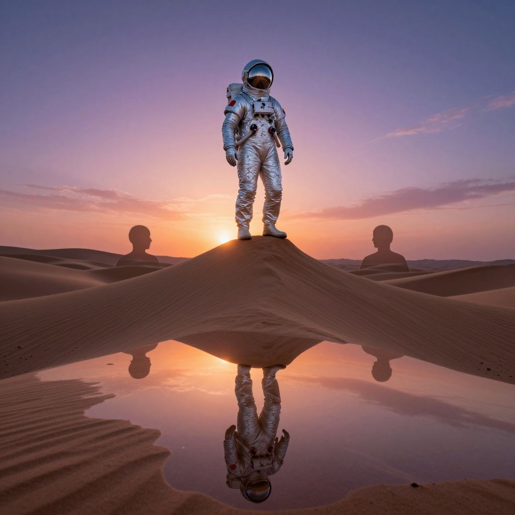 Photograph of an astronaut in a silver, reflective spacesuit standing on a sand dune during a sunset. The astronaut's reflection is mirrored in a shallow puddle at the base of the dune. The sky is a gradient of purple, pink, and orange hues. Two shadowy, circular formations are visible in the background. The sand dune has a smooth, rippled texture. The astronaut's helmet is glossy, reflecting the sunset colors. The overall composition is symmetrical, with the sunset light casting a warm glow on the scene.