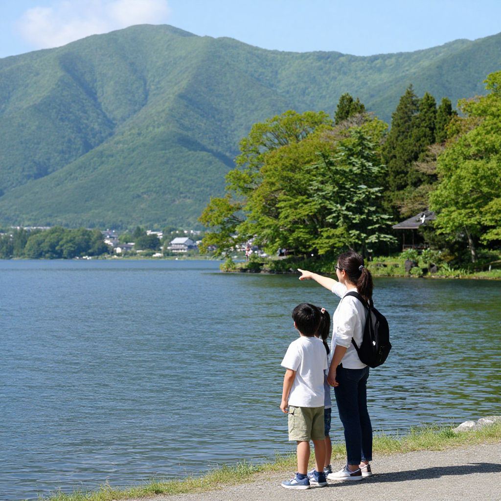 Family enjoying a scenic lakeside view in Hakone, with a woman pointing out landmarks to two children as they stand together near the water's edge, surrounded by lush green mountains and vibrant trees.