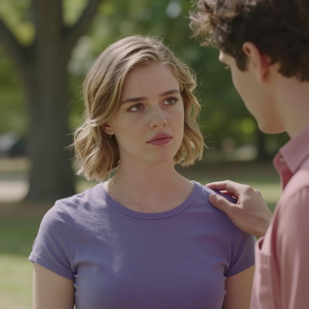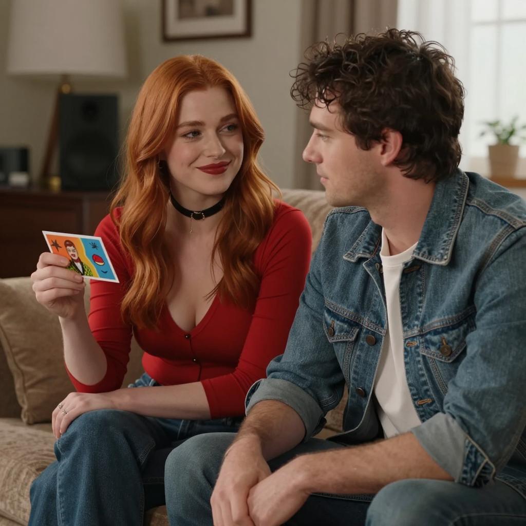 Photograph of a woman with light red hair, fair skin, and intense expression facing a man with dark brown hair and a green jacket. Background includes a lit lamp and blurred curtains. Woman's right side and man's back visible.