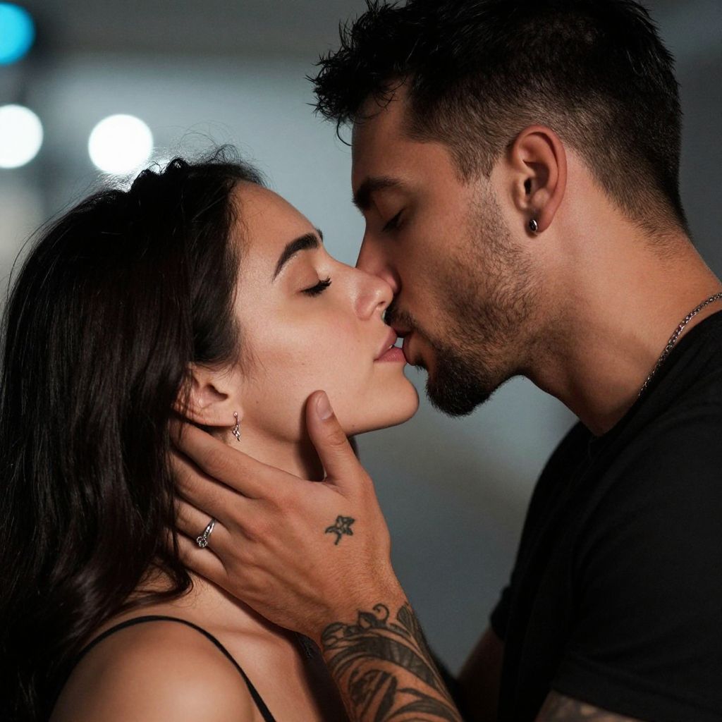 A close-up, dramatic photograph of a passionate couple. The man, with short black hair, a beard, and tattoos, gently holds the woman's face with both hands as they lean in for a kiss. The woman, with long dark hair, has her eyes closed and a silver ring on her right hand. The background is blurred with soft white and blue lights, creating an intimate and romantic atmosphere.