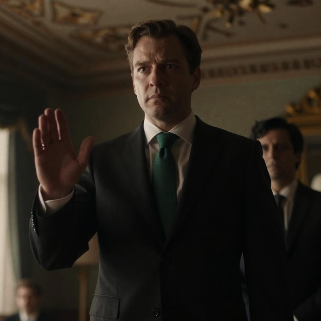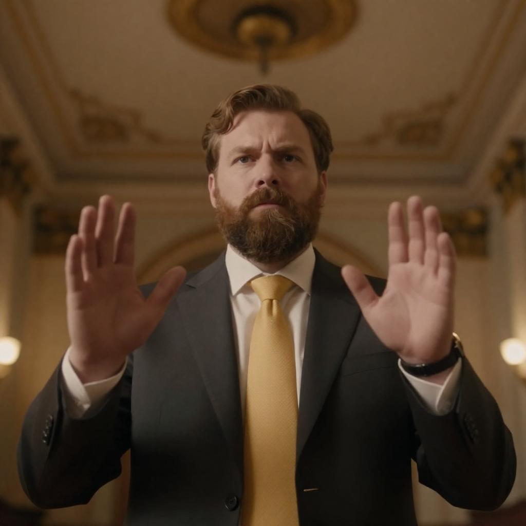 Portrait of a bearded Caucasian man with medium build wearing a dark suit and yellow tie, standing indoors with hands raised. The background features a dimly lit, ornate ceiling with warm amber lighting, creating a formal and dramatic atmosphere. The man has a serious expression and wavy brown hair.