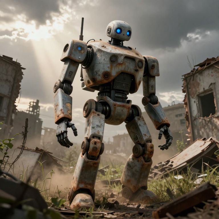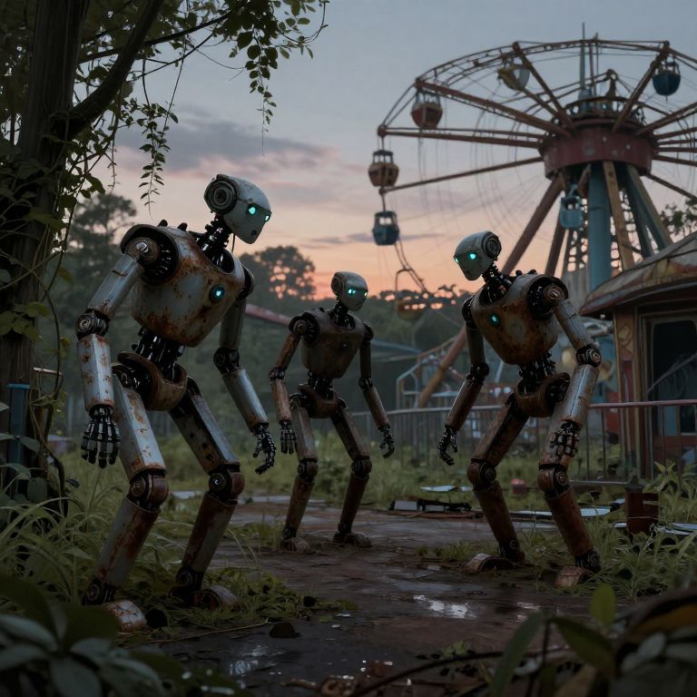 Fnia stylized animatronic character standing in an abandoned amusement park at dusk, rusted metal and wires exposed, soft twilight glow, subtle fog and overgrown plants, cinematic depth of field, dramatic shadows and highlights