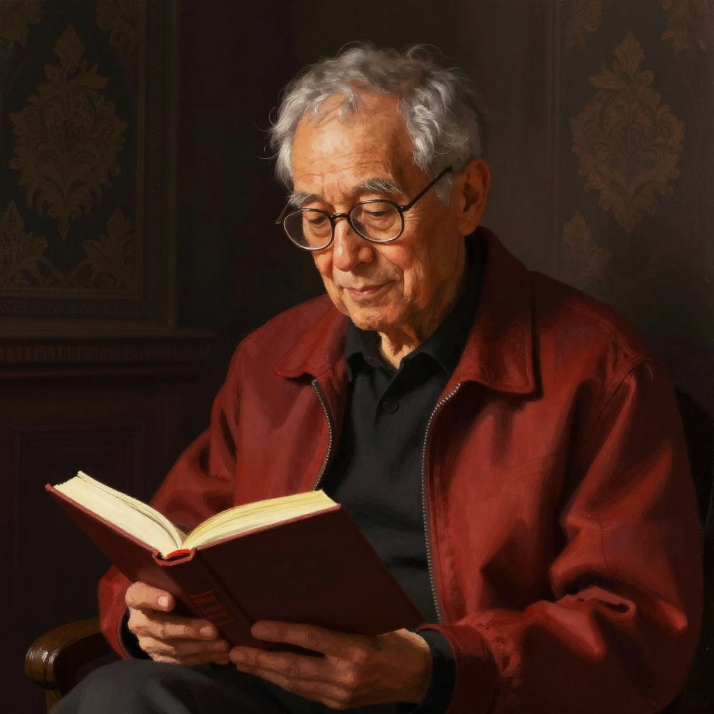This is a digital painting of an elderly man with gray hair and glasses, sitting and reading a book. He's wearing a red jacket over a black shirt, and holding a small red device in his right hand. The background is dark and textured with an ornate, patterned wall. The man looks calm and focused, with a gentle smile. The lighting casts a warm glow on his face.