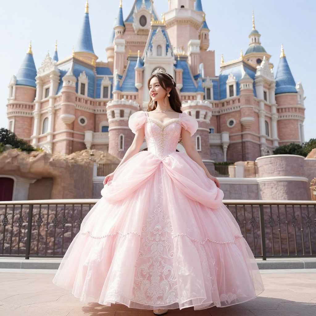 Big Princess Dress, a woman in a pink dress standing in front of a castle