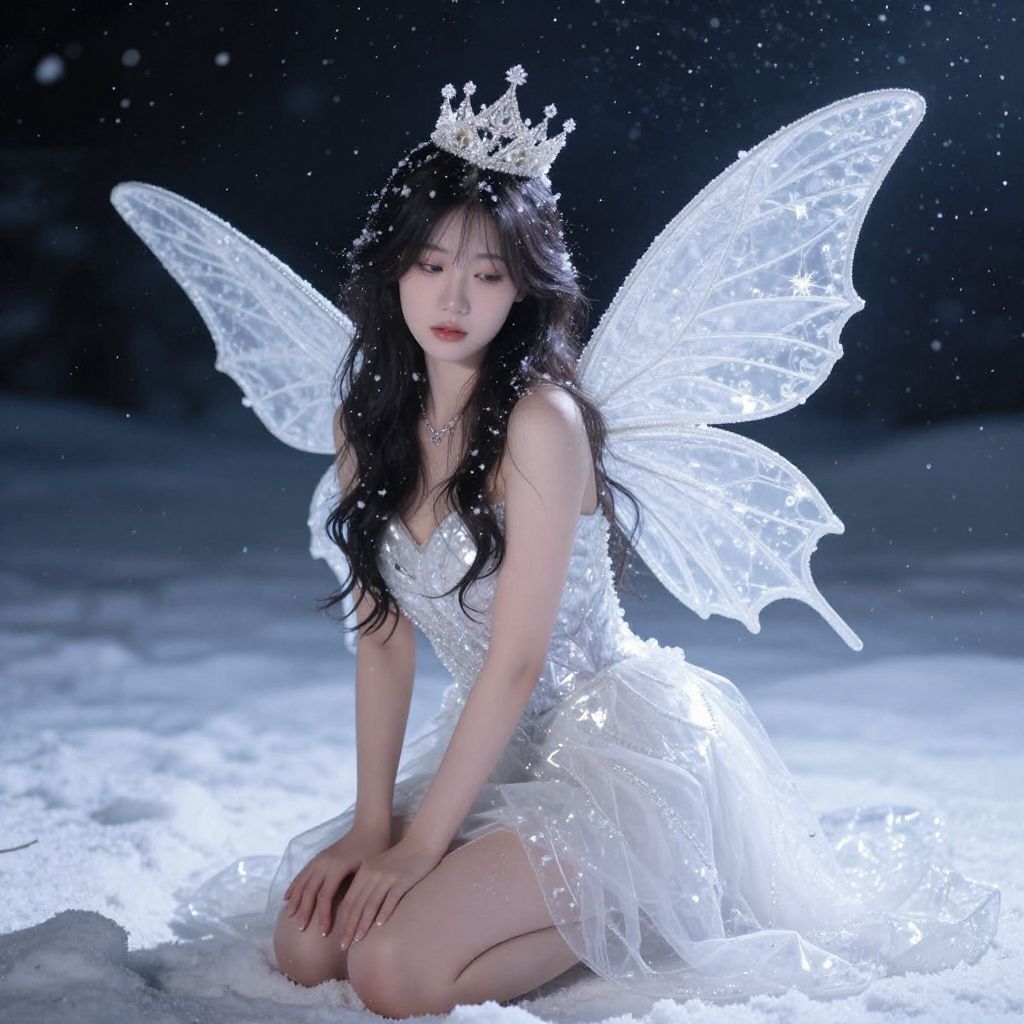 Photograph of an ethereal Asian woman with long black hair, wearing a white crown, glowing fairy wings, and a sparkling dress, kneeling in snow