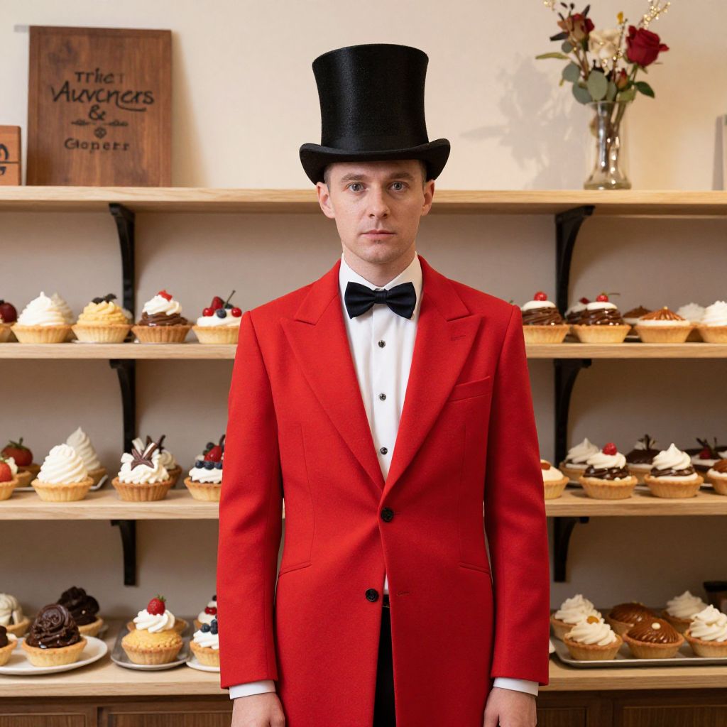 Tarts And Vicars Fancy Dress, man in a red coat and top hat standing in a store