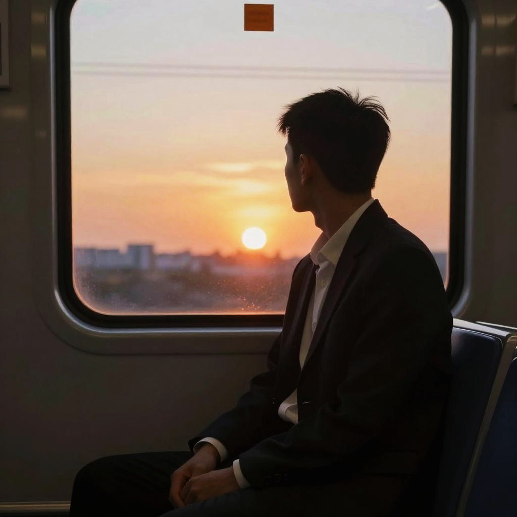 A person sitting on a bus during sunset, warm soft light coming through the window, silhouette with blurred details, vintage film look with grainy texture, orange and brown color tone, nostalgic and calm atmosphere