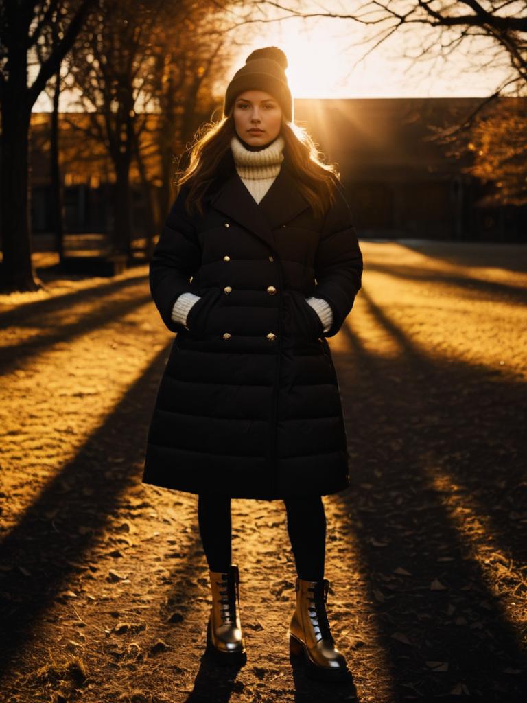 Woman, winter chic, oversized black down puffer coat, mid-calf length, wide horizontal quilting, large puffed collar, cuffed sleeves, white knitted sweater with central black star motif, A-line black midi skirt, opaque black leggings, chunky black boots with ridged soles, black gloves, pink beanie, studio background. --sref 1408