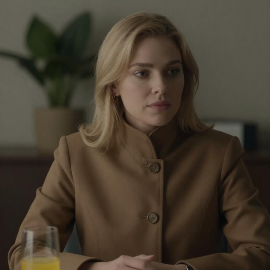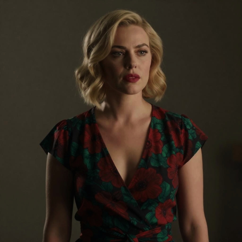 Photograph of a blonde woman in a deep red, sleeveless dress with a plunging neckline, talking on a blue phone. She has red lipstick and a focused expression. Blurred man in a suit with an outstretched arm in the background. Warm, dim lighting.