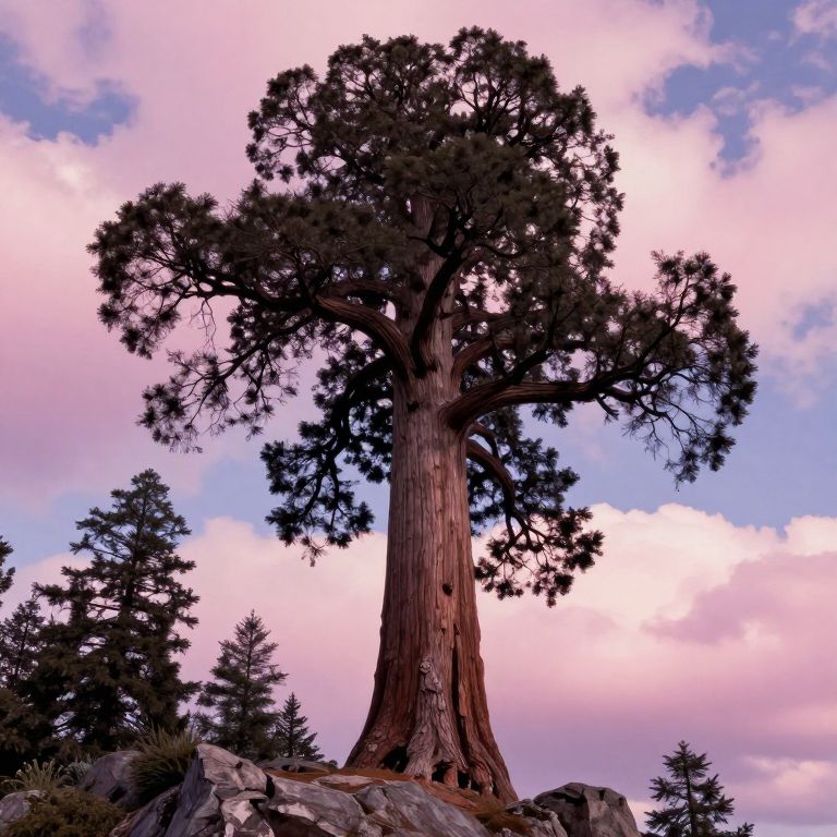 The image depicts a towering sequoia tree, rendered in a traditional art style reminiscent of Rebecca Guay's work. The tree stands majestically against a backdrop of a serene, cloudy sky, with hues of pink, mauve, and baby blue creating a dreamy atmosphere. The tree's bark is textured and rugged, with deep, twisting branches extending outward in a symmetrical pattern. The leaves are dense and dark, contrasting with the lighter sky. The tree is situated on a rocky outcrop, with smaller trees and shrubs scattered around its base, adding depth and a sense of scale to the scene. The overall composition is balanced, with the tree centrally positioned and the surrounding elements framing it, creating a sense of harmony and tranquility.
