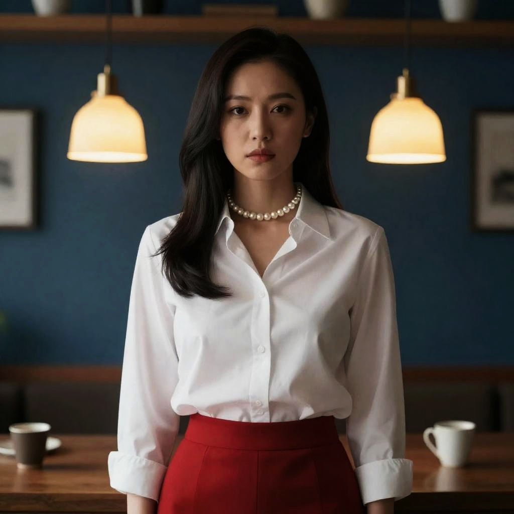 Photograph of a woman with fair skin and dark, wavy bobbed hair, wearing a beige, long-sleeved dress and a pearl necklace. She holds a vintage camera in her right hand, looking thoughtfully to the left. The background features dimly lit, wooden paneling and a staircase. Warm, soft lighting highlights her face.