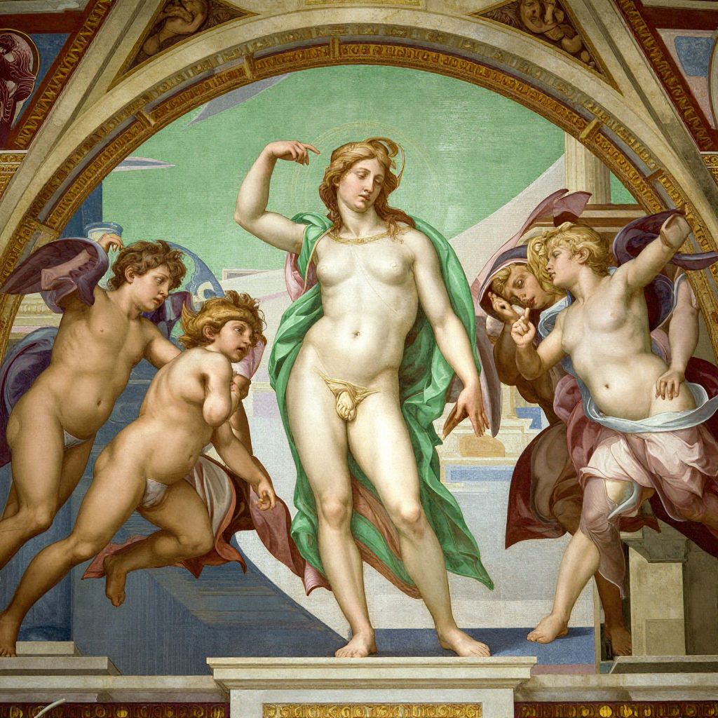 The image depicts a striking and elaborate fresco within the Sistine Chapel, reminiscent of Michelangelo's iconic works. The central figure is a nude woman with flowing, green drapery, her body adorned with intricate details and a serene expression. She is surrounded by a group of cherubs, each with wings and expressive faces, adding a dynamic and lively atmosphere to the scene. The background features a vibrant green sky, complementing the woman's drapery and creating a harmonious color palette. The fresco is framed by architectural elements, including arches and columns, which add depth and structure to the composition. The overall scene is a testament to the mastery of Renaissance art, with a focus on human anatomy, emotional expression, and a sense of movement that captivates the viewer.