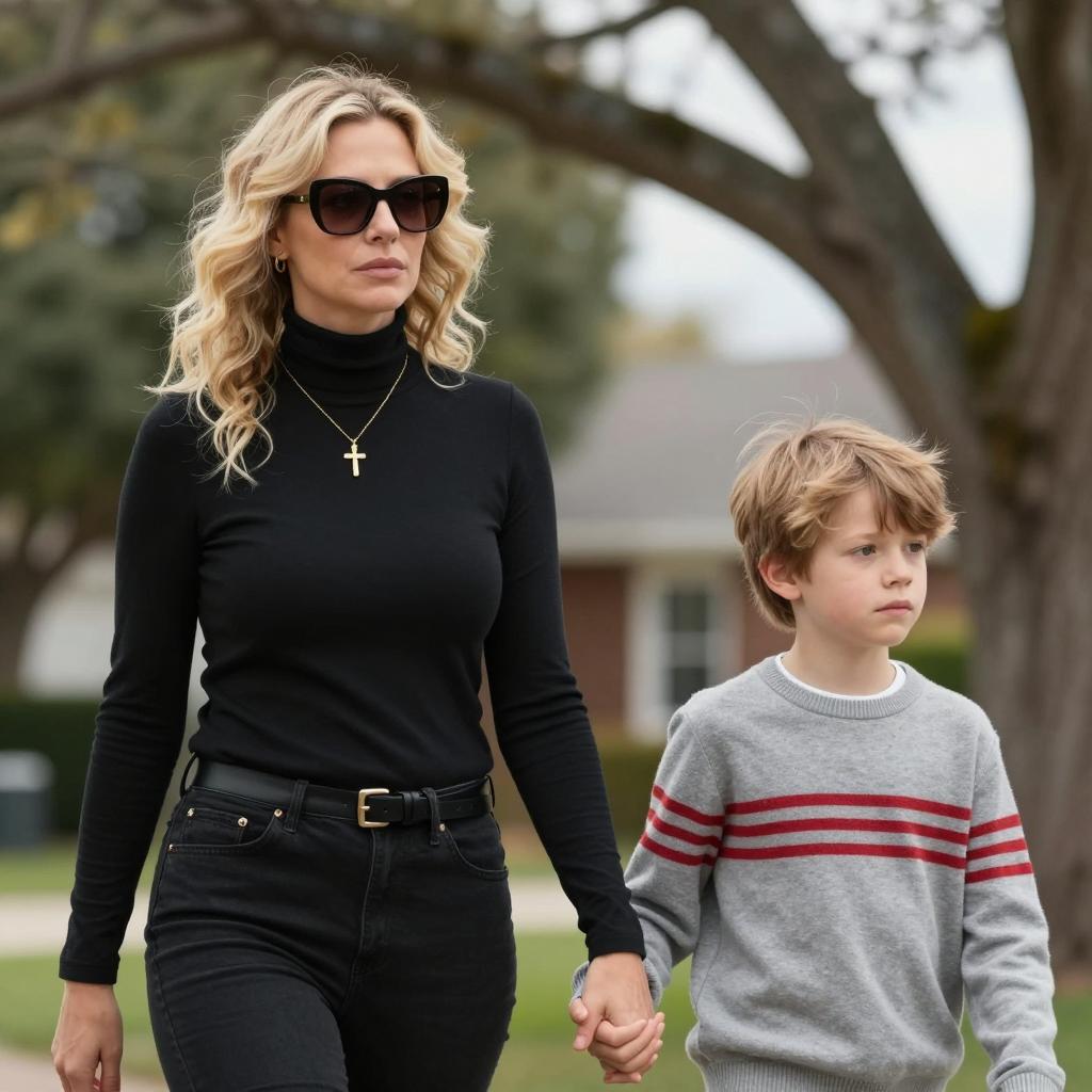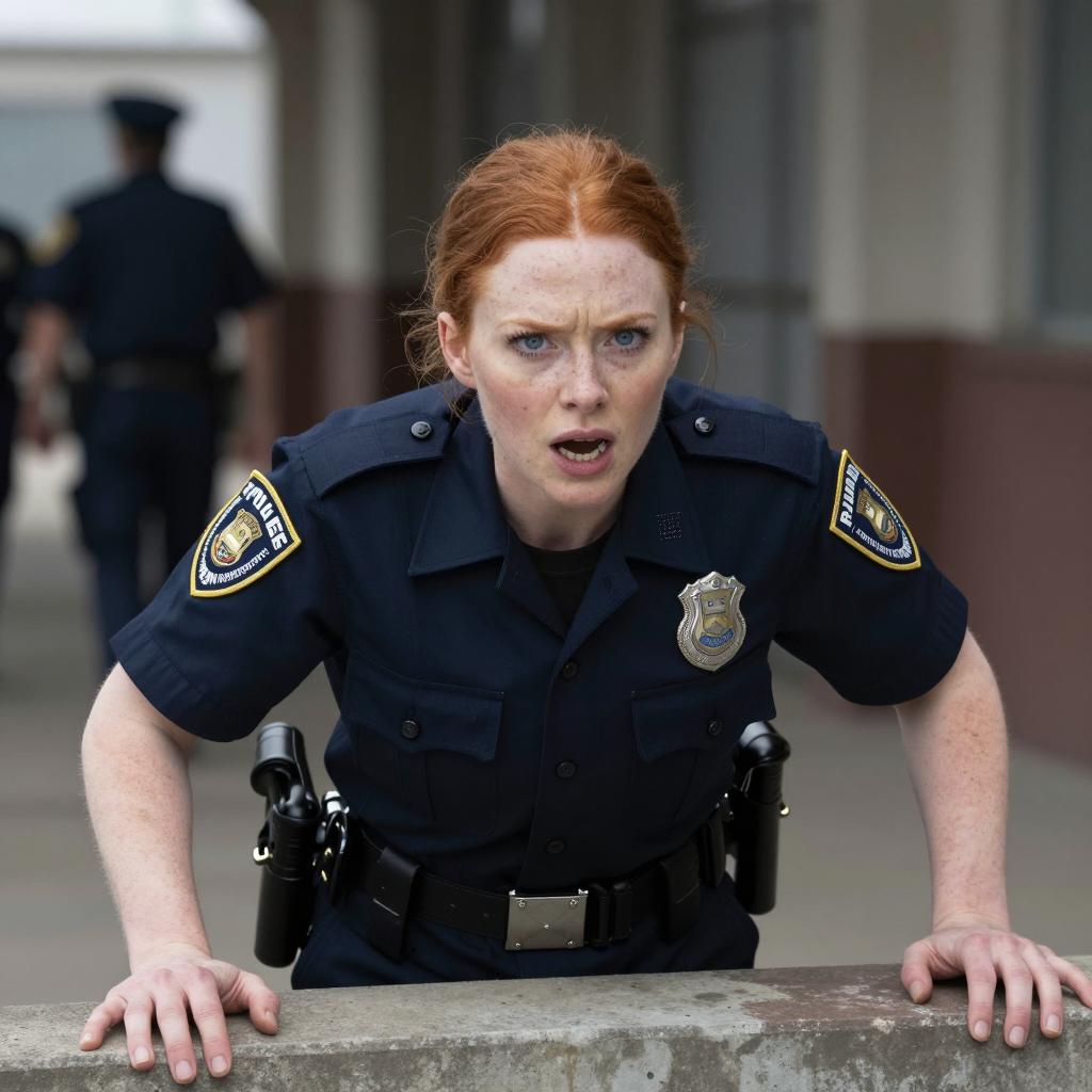 Blonde woman in red off-shoulder top and black skirt walks past four mounted police officers in dark uniforms. She holds a red object in her right hand. Background includes brick buildings and a lamppost. Horses and officers are to her left and right. Three additional officers are partially visible behind her. Daylight.