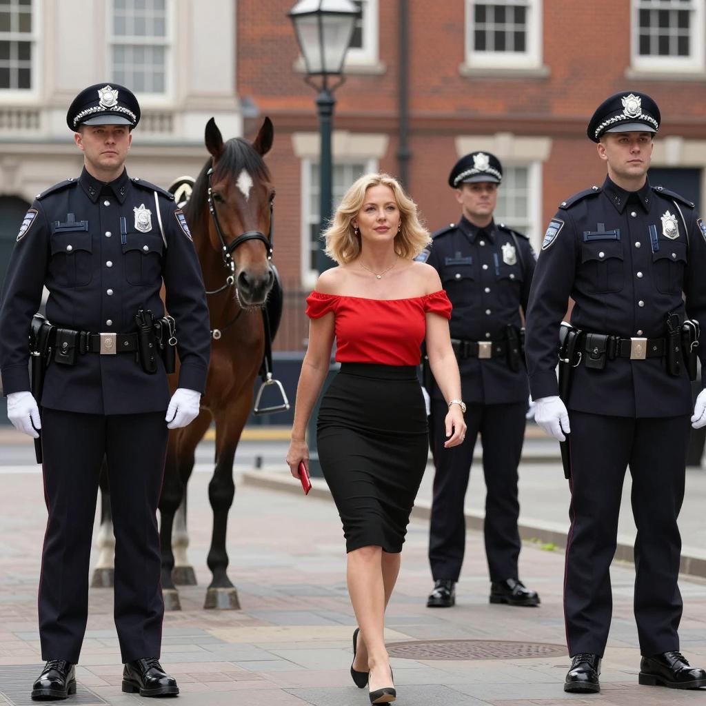 A blonde woman wearing a red off-shoulder top and a black pencil skirt walks confidently between four uniformed mounted police officers. The officers are dressed in dark blue formal police uniforms with white gloves and caps. Two brown horses stand behind the officers. The setting is an urban street with brick buildings and a black lamppost in the background. The woman holds a red object in her right hand and wears black heels.