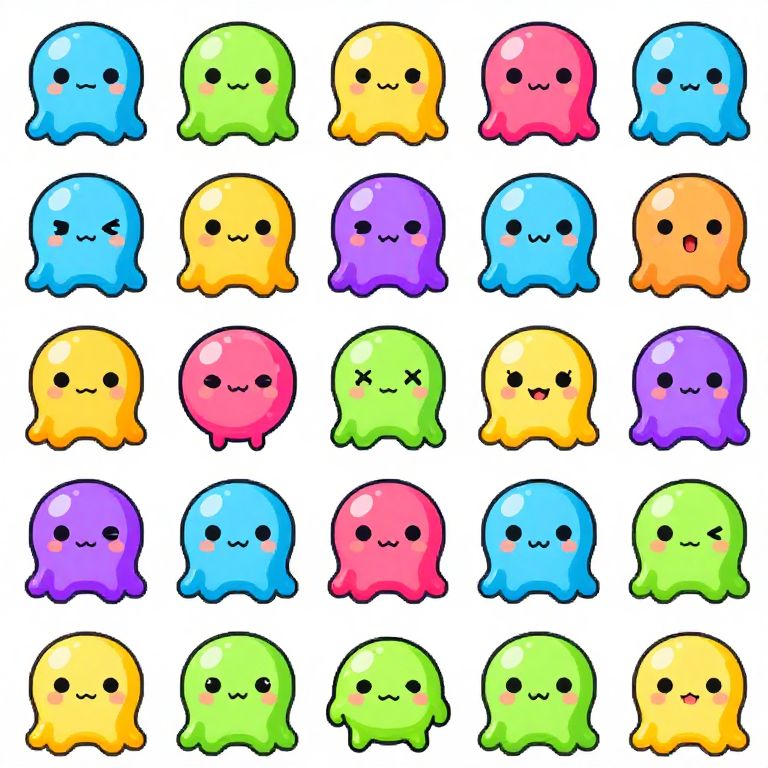Slime sprite sheet featuring cute, colorful gelatinous blobs in various expressions and poses, pixel art style, vibrant palette, game asset design, 2D animation frames