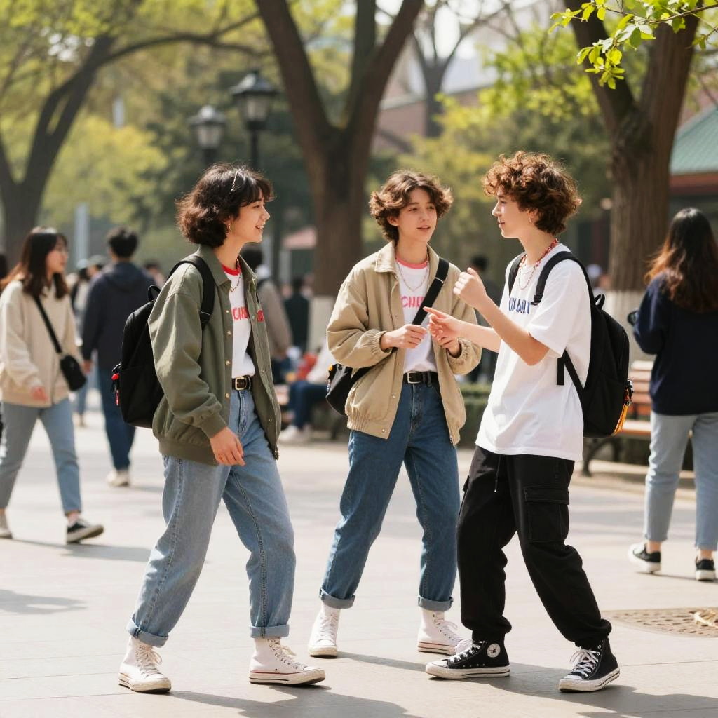 Crossdresser teens enjoying a lively park scene in spring, casual streetwear with colorful accessories, playful interactions, bright daylight filtering through trees