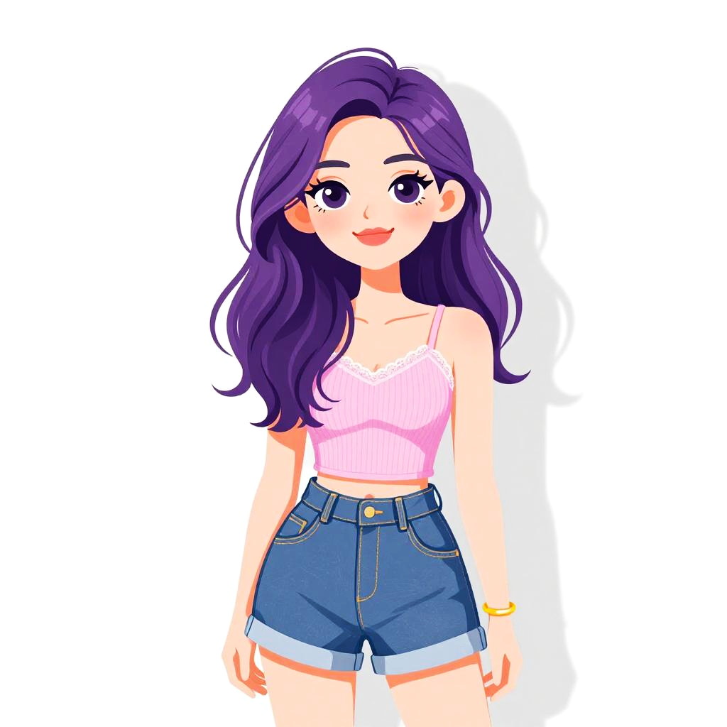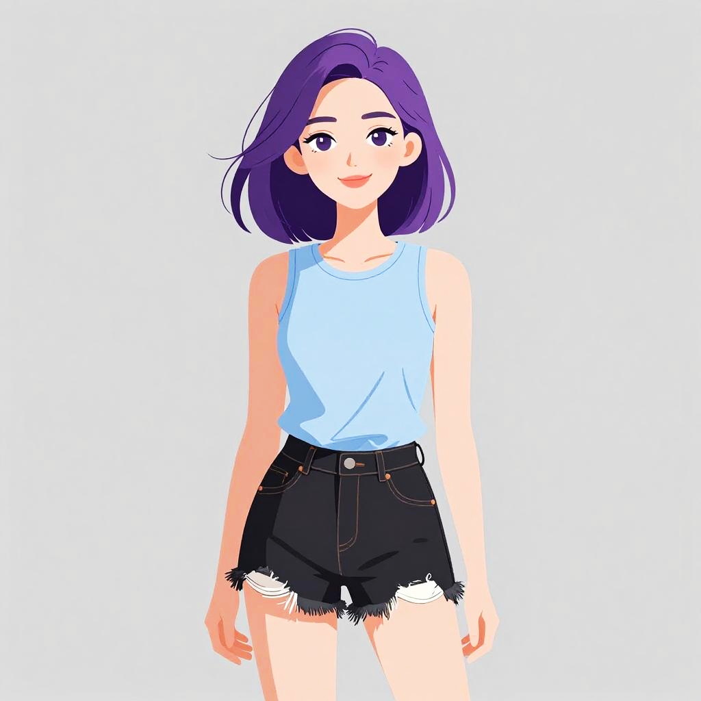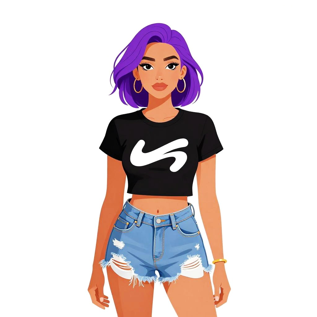 Woman with pretty face and pretty hair. smiling Woman, casual streetwear, heather grey cropped t-shirt with a red Nike logo, rolled-up short sleeves, high-waisted denim shorts with frayed hem and distressed details, light wash, solid grey background. --sref 1467