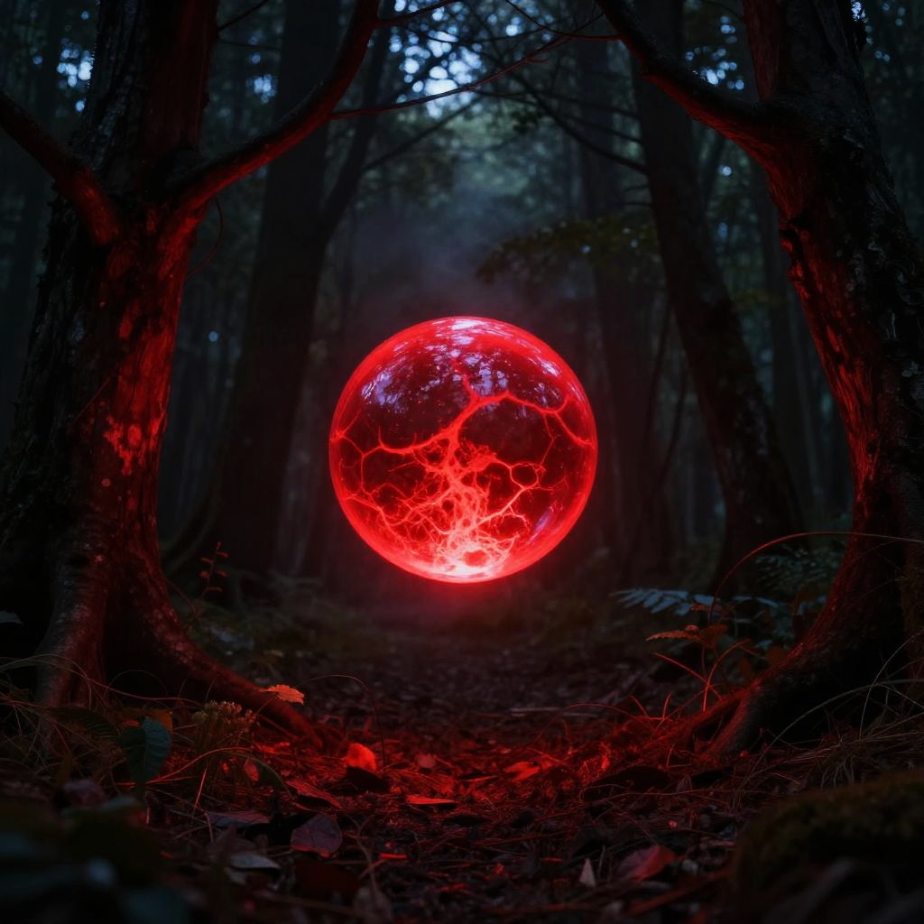 Red glowing ball floating above a dark forest floor at night, casting eerie crimson light on the surrounding twisted trees, mist swirling gently, mysterious and magical atmosphere, ultra-realistic style with high contrast shadows and vibrant highlights.