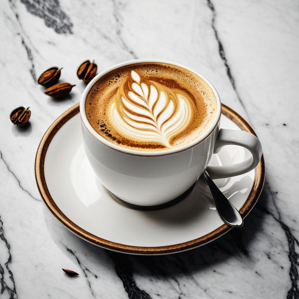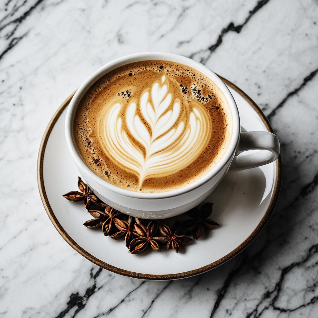 Latte coffee cup with cardamom, in the style of Paul Hedley, intricately textured, nostalgic atmosphere, UHD image, marble background