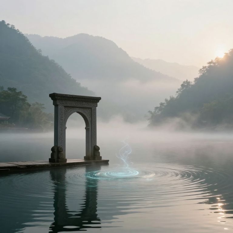 Madina prompt at a tranquil lake surrounded by foggy mountains, a lone archway with ancient carvings, soft morning light, mystical energy flowing through the water, dreamy and peaceful, cinematic composition