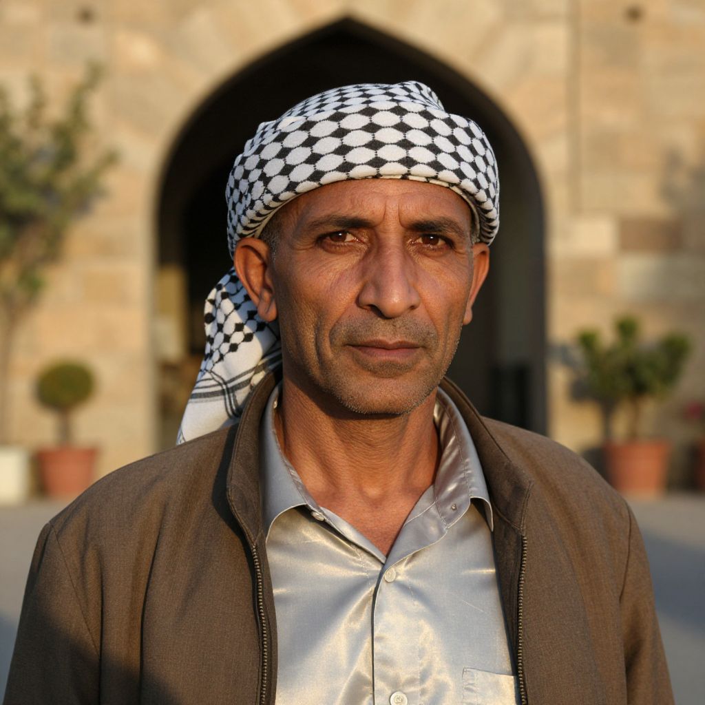 Photograph of a middle-aged man with olive skin and dark eyes, wearing a patterned white and black headscarf, a brown jacket over a shiny silver shirt. He stands in front of a blurred stone archway with warm, golden sunlight casting shadows. The background includes potted plants and a hint of blue sky. The man has a calm, slightly serious expression.