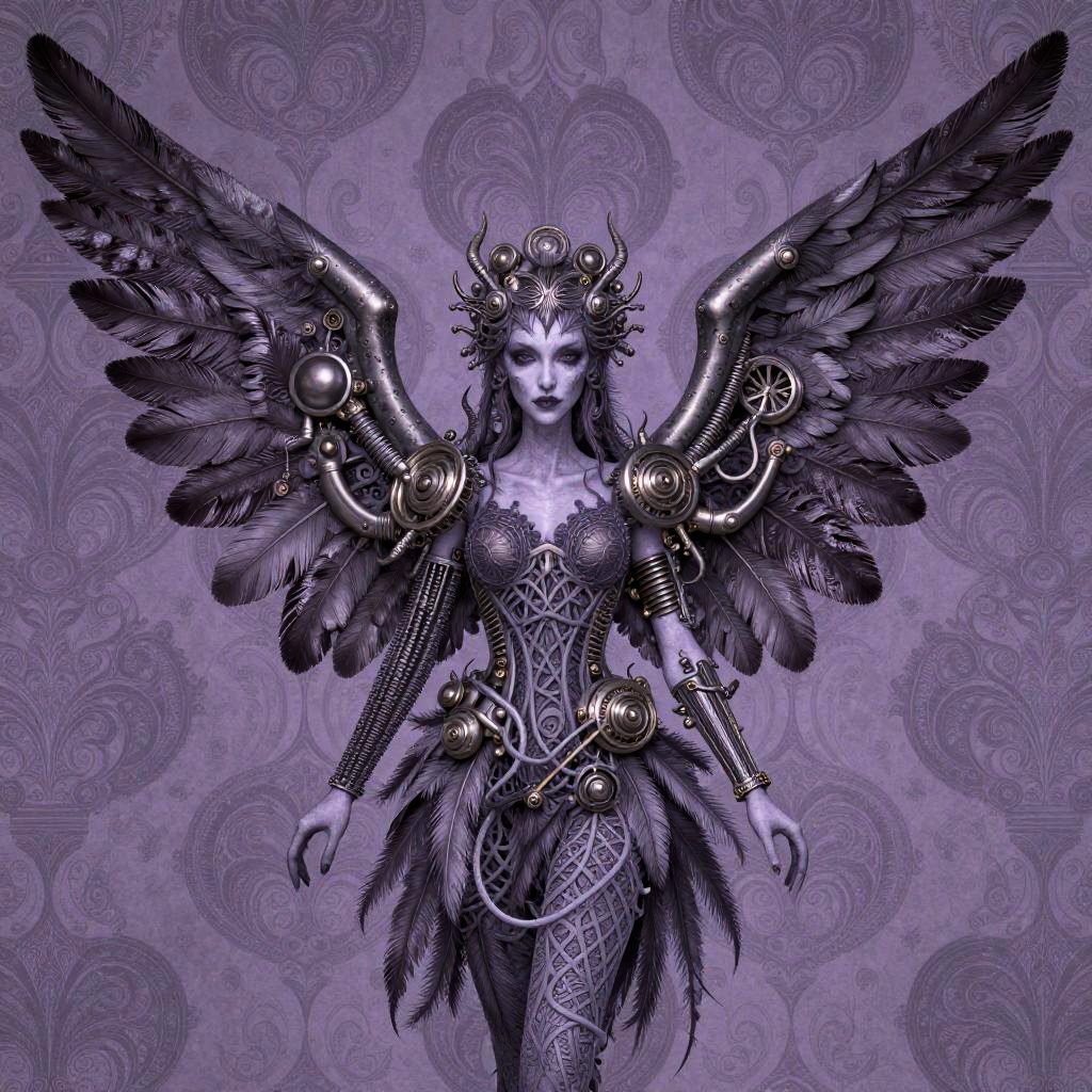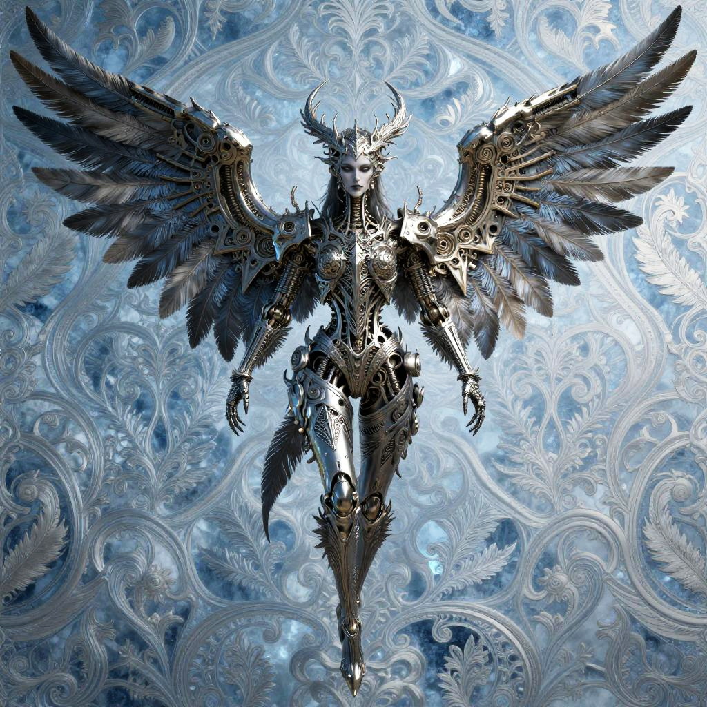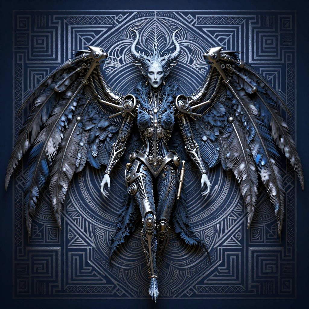 Gothic angel with intricate feather patterns and mechanical wings, set against a ivory and sapphire blue patterned background. The design showcases a mix of organic and mechanical elements, with the wings featuring both feathered and metallic details. Rendered in a style inspired by John Jude Palencar, Hajime Sorayama, the artwork highlights contrast and includes highly detailed, intricate patterns for a dramatic effect.
