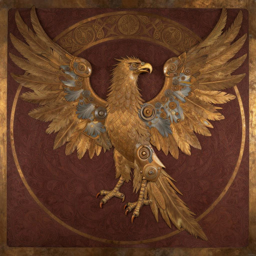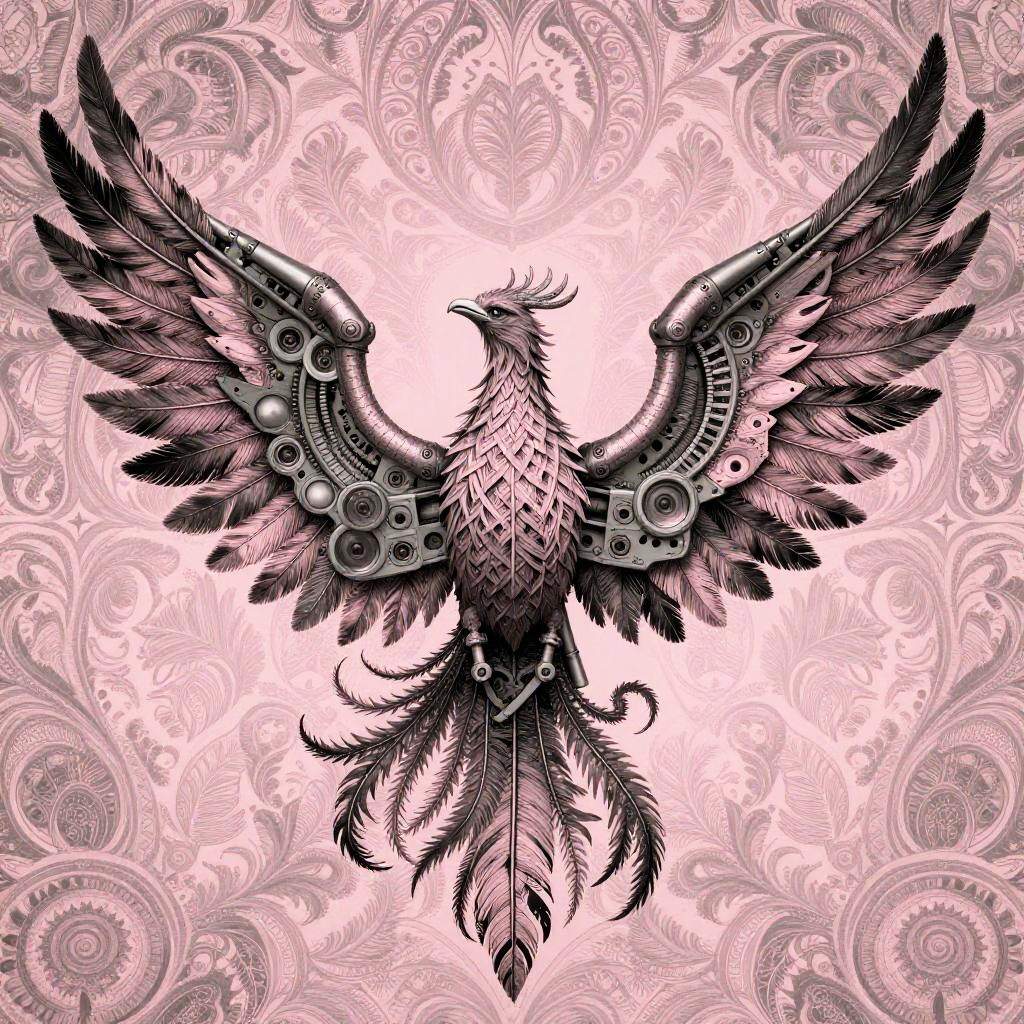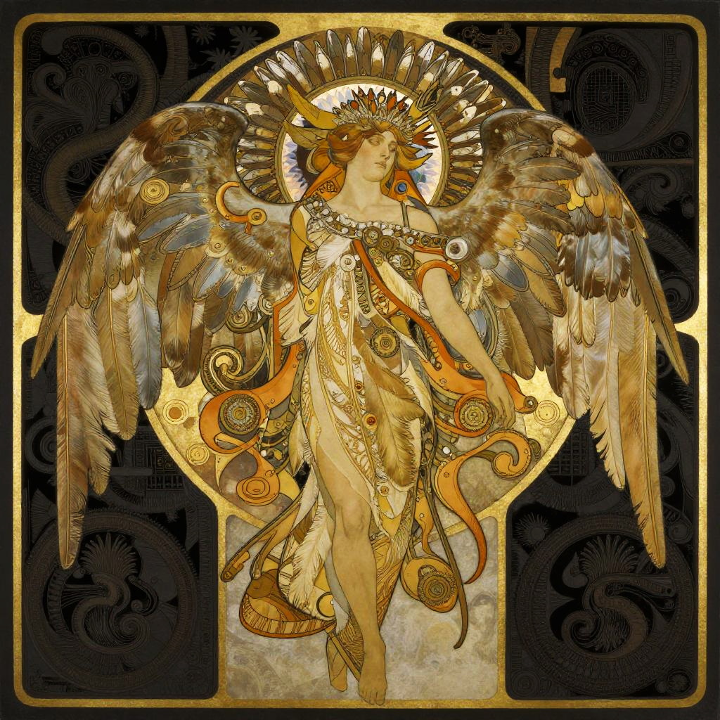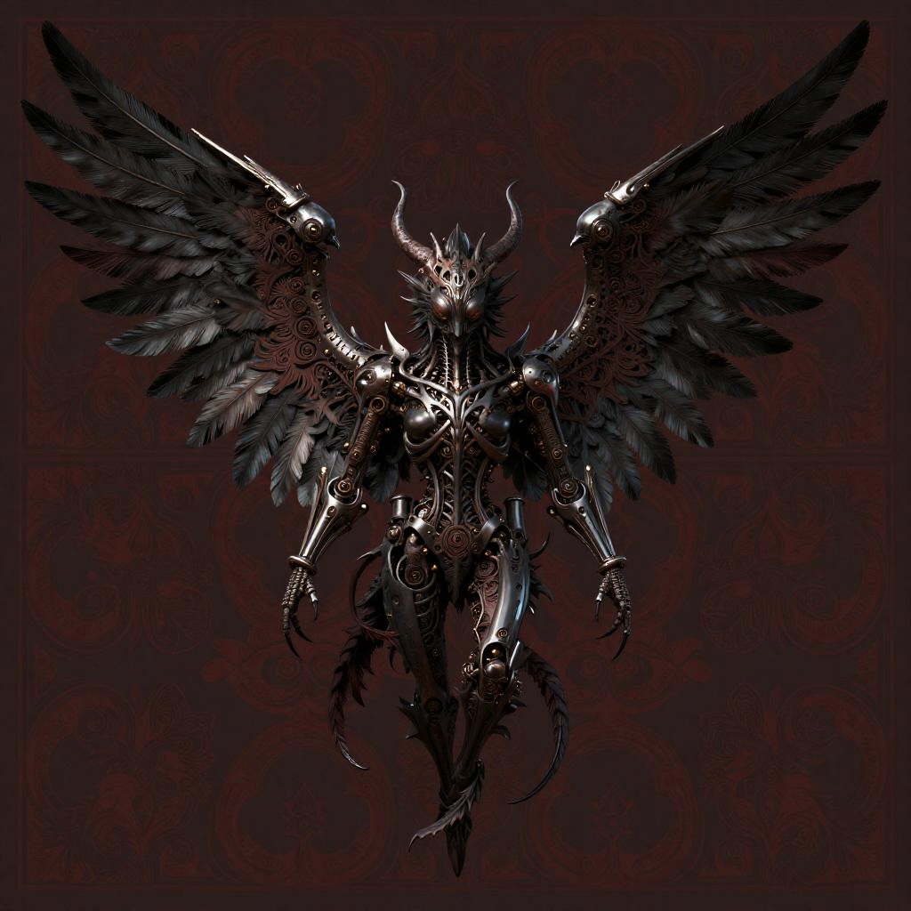 Gothic angel with intricate feather patterns and mechanical wings, set against a ivory and sapphire blue patterned background. The design showcases a mix of organic and mechanical elements, with the wings featuring both feathered and metallic details. Rendered in a style inspired by John Jude Palencar, Hajime Sorayama, the artwork highlights contrast and includes highly detailed, intricate patterns for a dramatic effect.