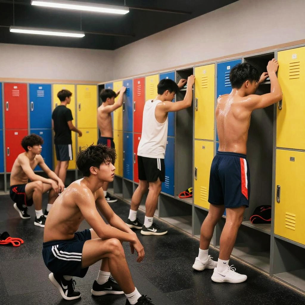 Teen boy locker room filled with energetic young athletes changing, vibrant lockers, dynamic lighting highlighting sweat and determination, modern sports facility atmosphere