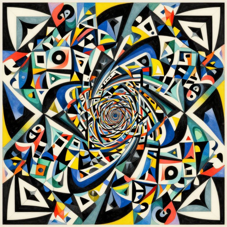 Craft an intricate abstract geometric composition, inspired by the swirling patterns of Escher-esque drawings, depicting a mesmerizing dance of interlocking shapes and infinite perspectives. View this visual symphony from an aerial vantage point, looking down upon a vast canvas where vibrant colors intertwine with black silhouettes, creating a sense of both harmony and dissonance. As one's gaze traverses the plane, observe how shapes shift and transform, suggesting movement through static form; a testament to the fluidity of perception in an orderly world. This dynamic equilibrium captures the essence of balance within chaos, inviting viewers to immerse themselves in the enigmatic depths of this abstract realm where infinite possibilities reside within geometric confines.