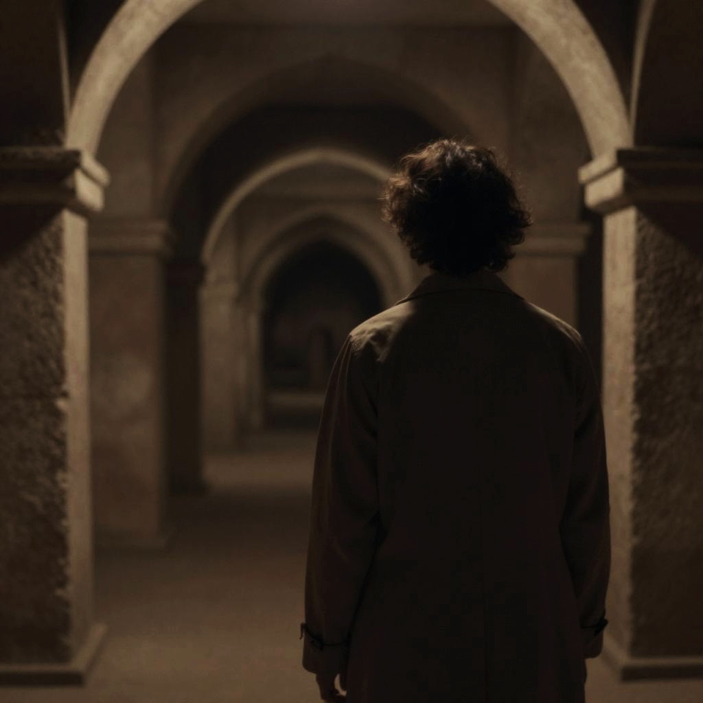 Realistic, masterpiece, detailed background, dim soft lighting, simple background, catacombs, from behind