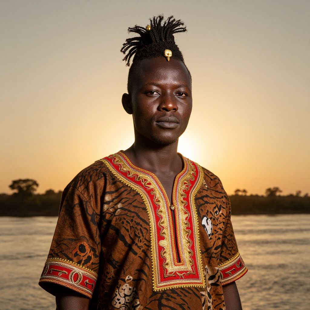 Photograph of a young African man standing outdoors at sunset. He has dark skin, a tall, slender build, and short, stylized black dreadlocks with a single, small gold ornament at the top. He wears a brown, short-sleeved, traditional African shirt adorned with intricate red and gold embroidery on the neckline and sleeves. The background features a calm, reflective body of water with a soft, orange-yellow sky transitioning to dusk, and silhouetted trees in the distance. The man's expression is neutral, and he stands centered in the frame, highlighting his cultural attire against the serene natural backdrop.