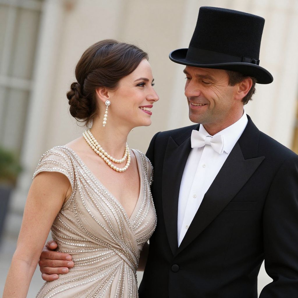 Elegantly dressed couple sharing a joyful moment, with the woman in a sparkling dress adorned with a pearl necklace and earrings, and the man in a classic tuxedo topped with a black top hat, both exuding sophistication and charm.